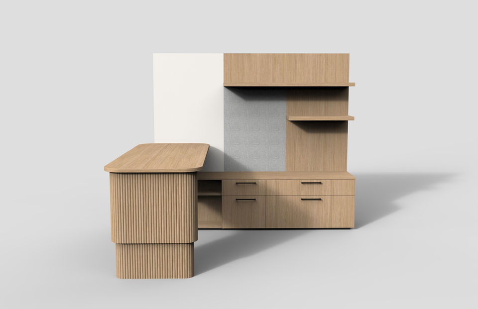 This height adjustable private office solution features wood slats, a freestanding wall and a run off configuration.